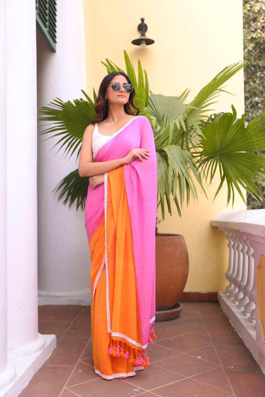 Pink Orange Tie Dye Mulmul Cotton Saree