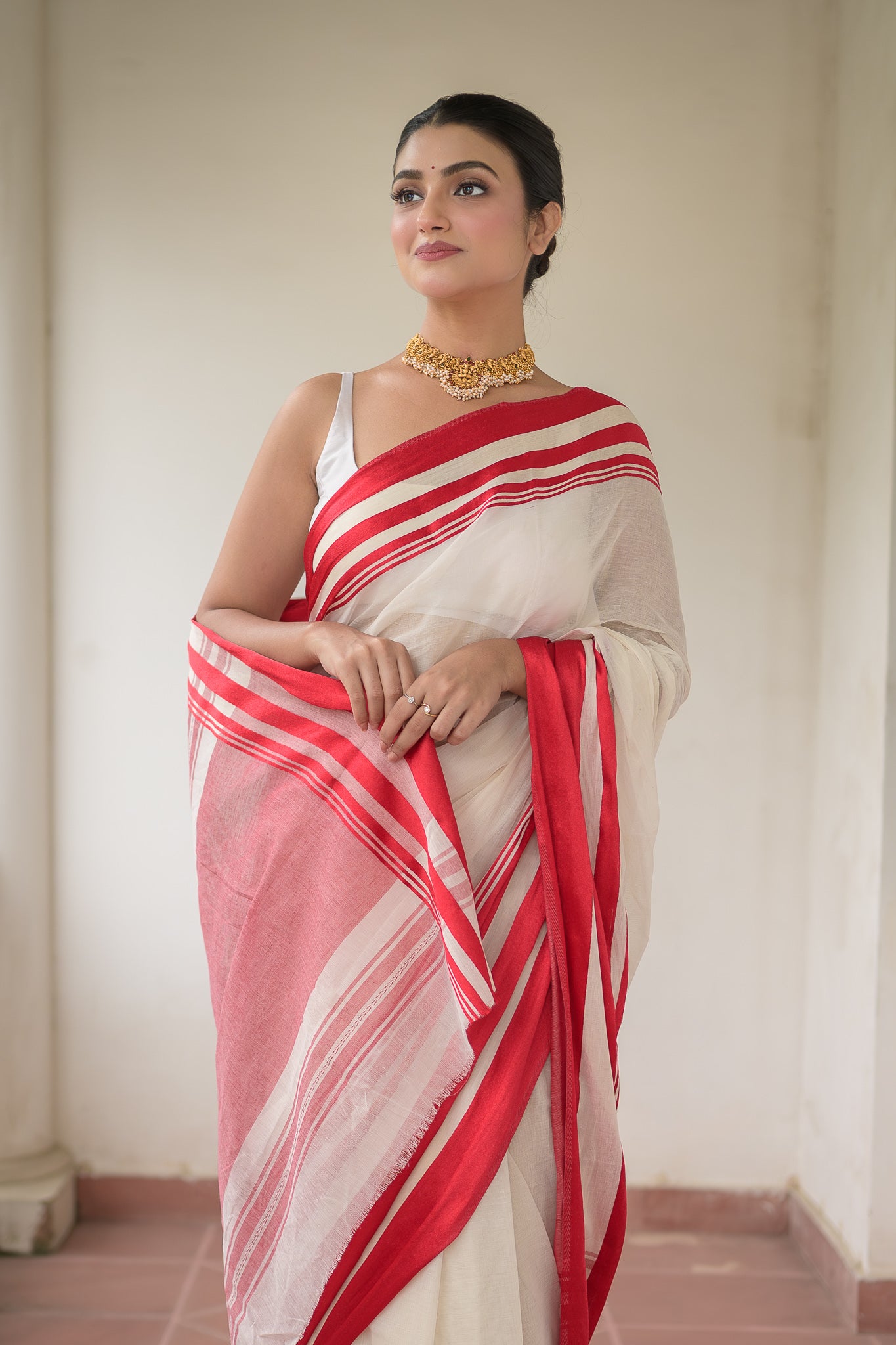 White And Red Pure Cotton Saree